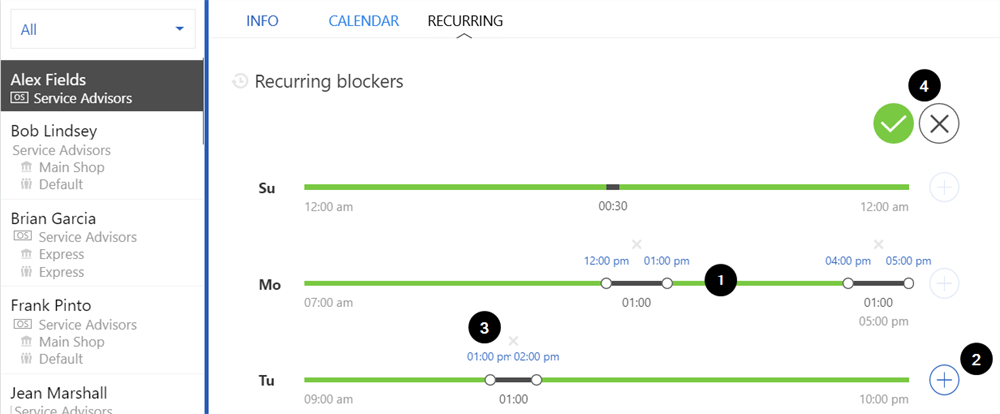 As on the Calendar tab, use the time lines for each day to set the recurring blocked times for the Service Advisor. The time lines default to the department’s working hours and holidays.