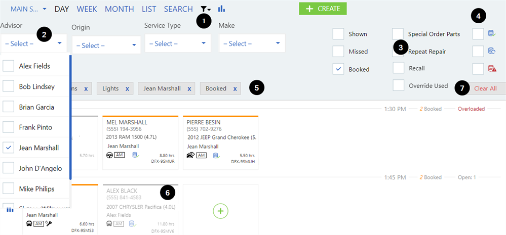 3. Use the check boxes to filter by status of appointment (Shown, Missed, Booked) and by appointments flagged as Special Order Parts, Repeat Repair, Recall or Override Used.