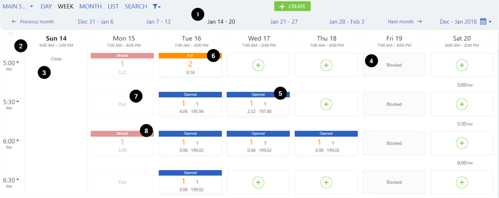 - Opened time slots (with a blue bar) will show how many appointments and hours are booked (in gold numbers), plus appointments and hours available before cutoff (in black numbers). The hours cutoff is set in  Administration.
