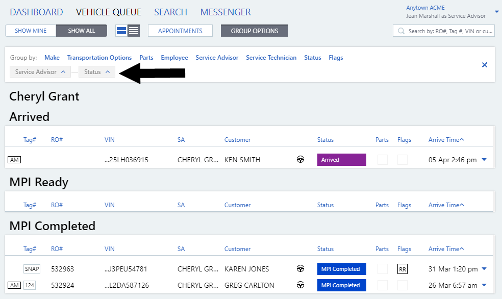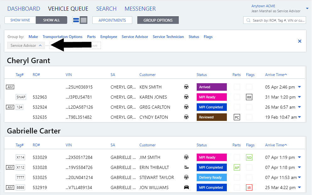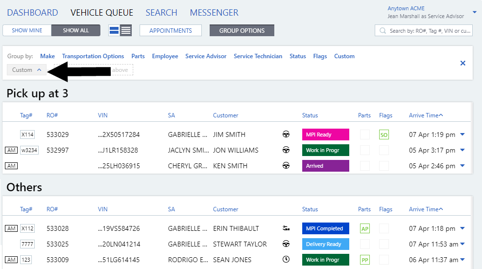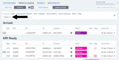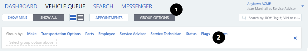 These controls allow you to sort and group the vehicles in the vehicle queue list by Make, Transportation Option, Parts indicator, Employee, Status, Service Advisor, Service Technician, Status, Flags, or by a Custom category defined by the