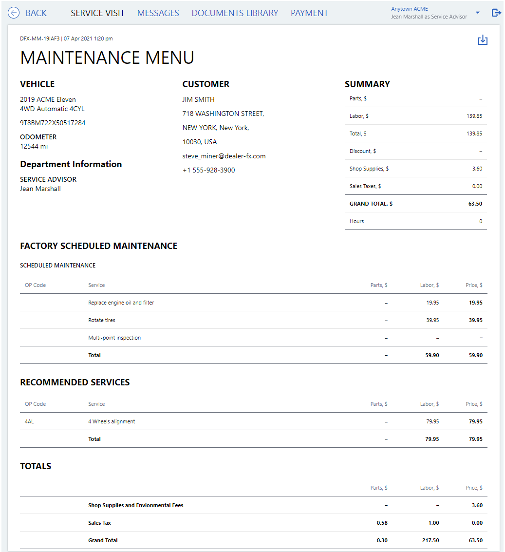 4. Final Documents includes PDF reports of today's service visit, including the customer service quote, pre-service write-up, the inspection report and maintenance menu.