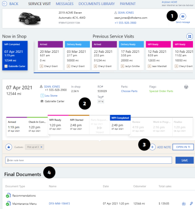 Access the Service Visit page, shown next, by clicking the "Details" button from the vehicle's service lane. You can attach notes specific to the service lane as well as review documents and history. There is also a feature to email and attach documents for your customer directly from Service Dashboard.