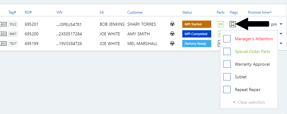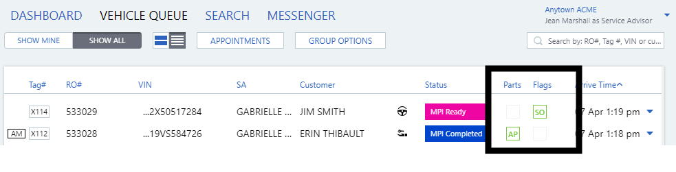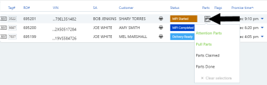 Note: The parts indicators and flags can also be updated in the expanded service lane.