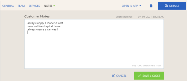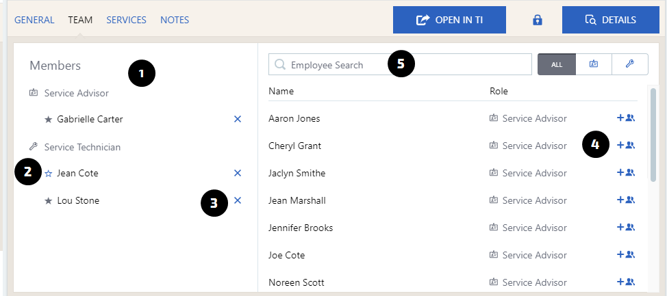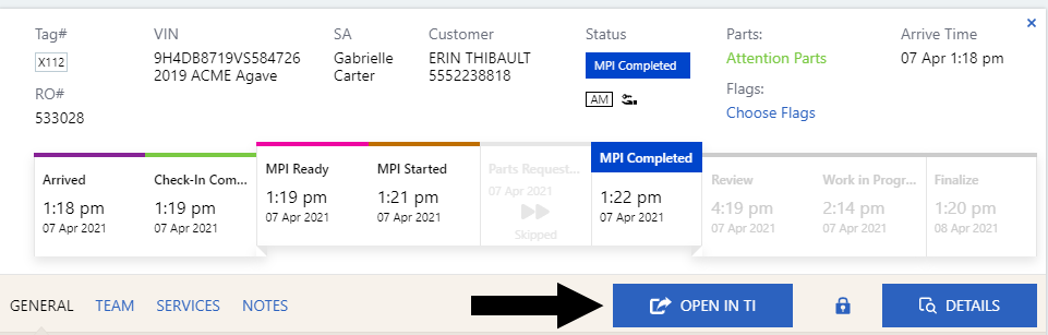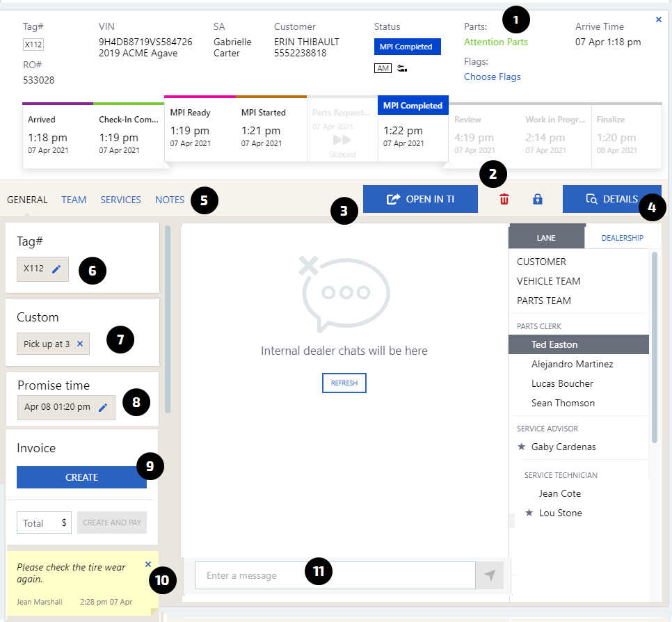 In the expanded service lane view, there are functions that let you work with the service lane such as accessing the applications; adding details; reassigning team members; messaging.