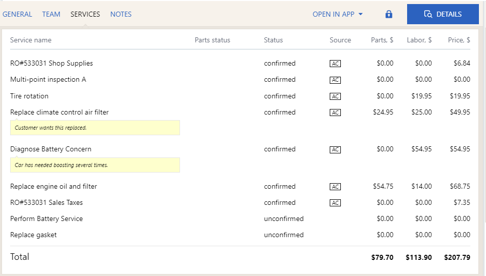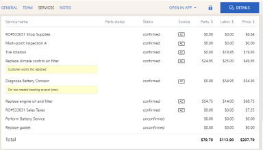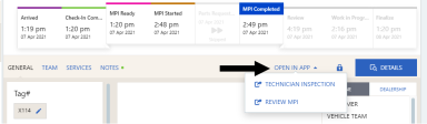 4. Click "Details" to open the Service Visit page for the vehicle. It shows additional information such as service documents as described in Managing the service visit .
