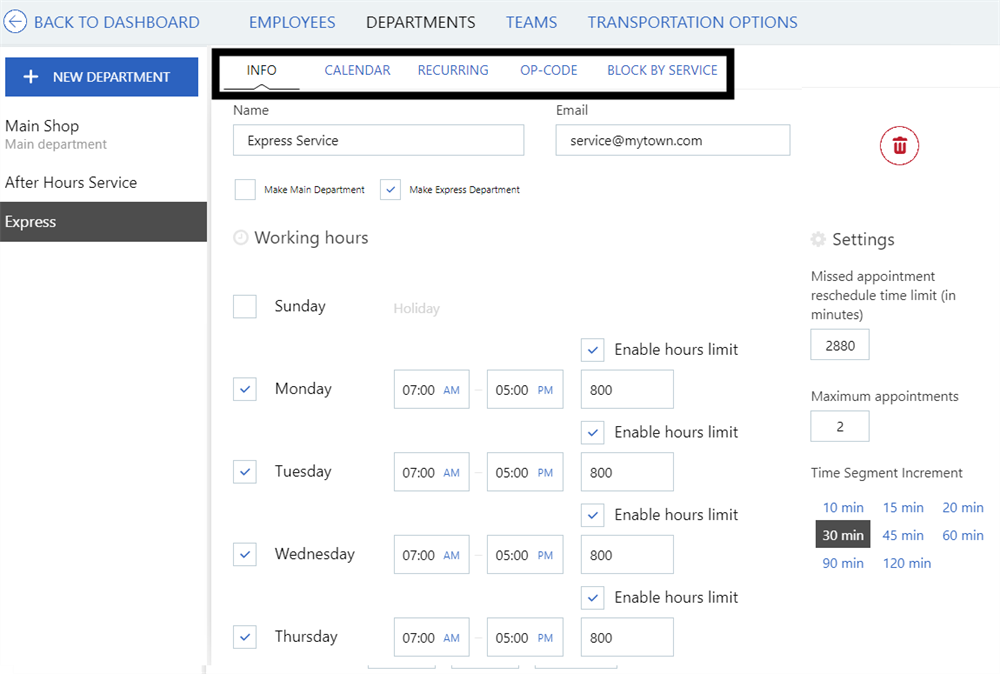 - Recurring is used to set recurring blocked time segments for the department, such as weekends.