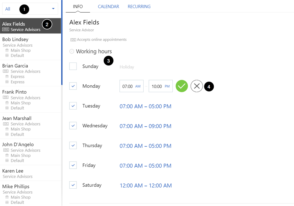 2. If the Advisor’s working hours have not been set up yet, they will default to their department’s working hours (Refer to Departments – Info tab for more information). Edit the working hours as follows:
