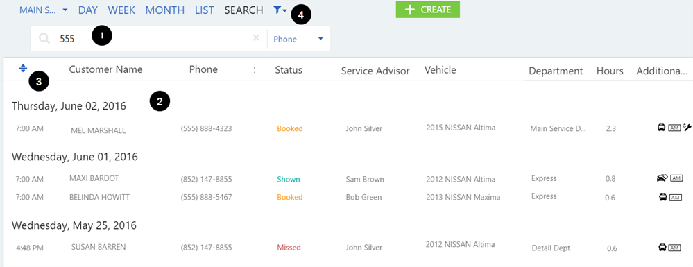 1. In the example above "555" was entered, and 'Phone' selected as a filter. The search returned all appointments with "555" in the Phone number.