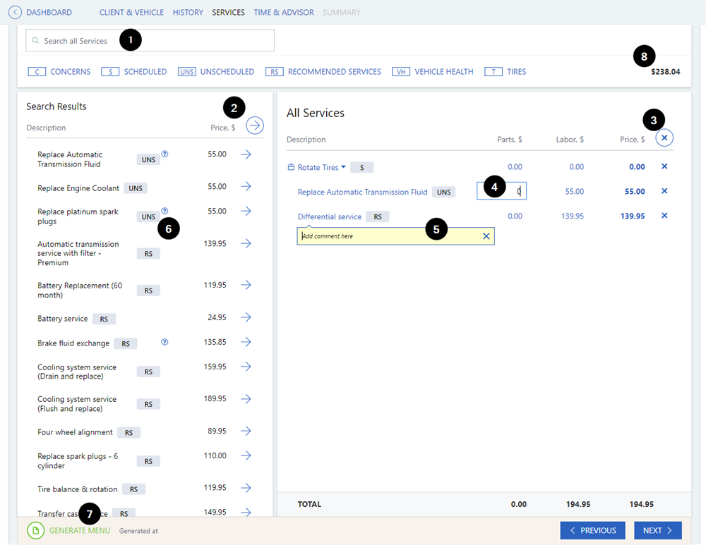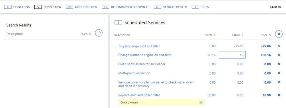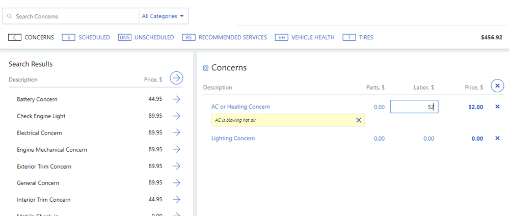 The Services pages are used to add concerns and services to the appointment using the following tabs: